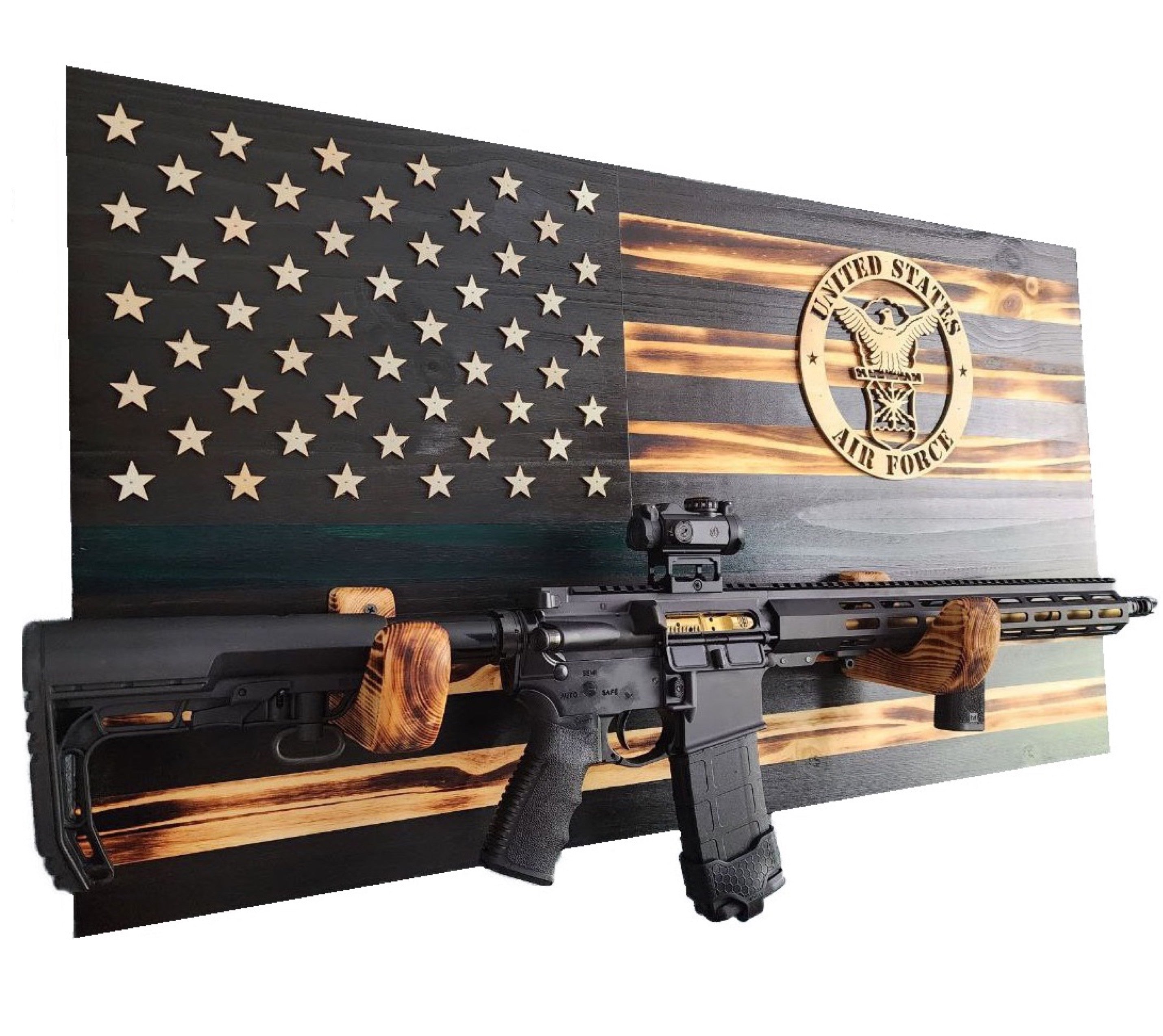 AIR FORCE Wooden Rustic American Flag with Gun Rack Handmade 36” x 19.5” Made in the US