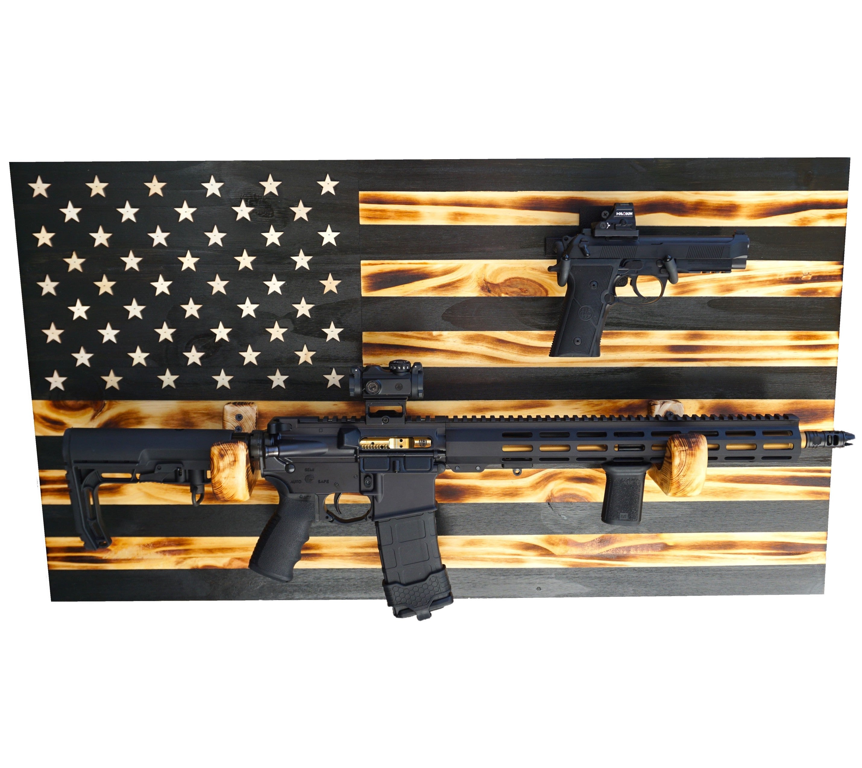 FOR TWO GUNS Wooden Rustic American Flag with Gun Rack 36” x 19.5” Black Made in the US