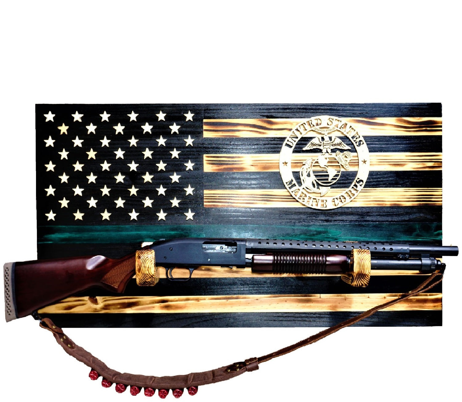 MARINE CORPS Wooden Rustic American Flag with Gun Rack Handmade 36” x 19.5”